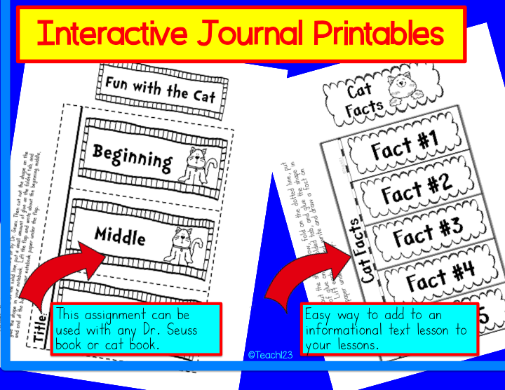You can set this up as a center or use it as seat work.  There are 2 interactive journal printables included.  Students will read a Dr. Seuss book or a cat book for the Beginning, Middle, and End assignment.  The Cat Fact assignment is an easy way to add an informational text lesson to your plans.